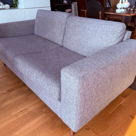 Den er god å sitte i, med faste og komfortable puter som holder fasongen fint. Hel og solid.