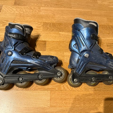 Rollerblade rulleskøyter i størrelse 37 i blå farge. Modellen har hardplast-ytterskall med justerbare spenner og hjul montert på ramme med fire hjul per skøyte. Egnet til bruk på asfalt og andre jevne underlag til fritidsbruk og trening på rulleskøyter.