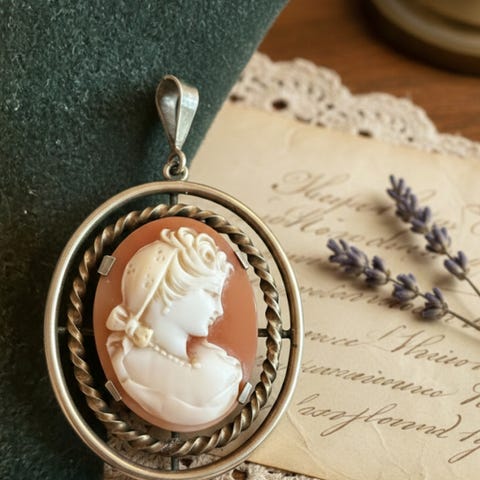Flott vintage brosje i kaméstil med detaljert ørkenmotiv – kameler, palmer og landskap i relieff. Ovalt design med pen ramme. Laget av celluloid eller et lignende plastmateriale. Lett i vekt. Se bilder for mål.