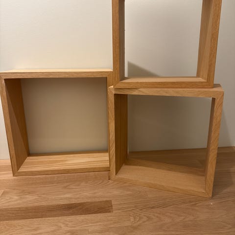 Hyller med målene 30x30 og dybde 20 cm selges samlet.