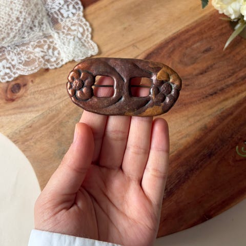 Rustikk vintage brosje med stein i midten og fin metallplate. Metallet har mørk patina og varme toner – kan ligne kobber eller bronse (usikker på metalltype). Unikt og kunstnerisk design. Se bilder for mål. ✨