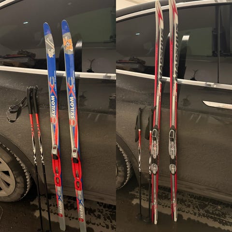 Ski 160 cm, Staver 130 cm, den ene er litt bøyd, men kan sendes med hvis ønskelig