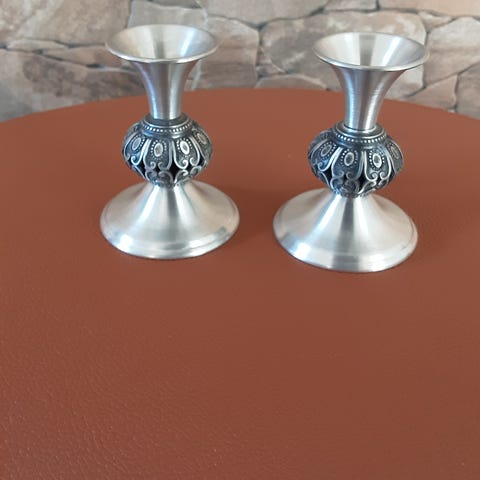 Norway lysestake i tinn med relieffdekor rundt midtpartiet. Motivet viser figurer og naturdetaljer i et bånd rundt staken. Lysestaken har rund fot med filt under og bred lysskål til kronelys. Passer som bord- eller vindusdekorasjon og kan brukes alene eller sammen med andre lysestaker i tinn.
