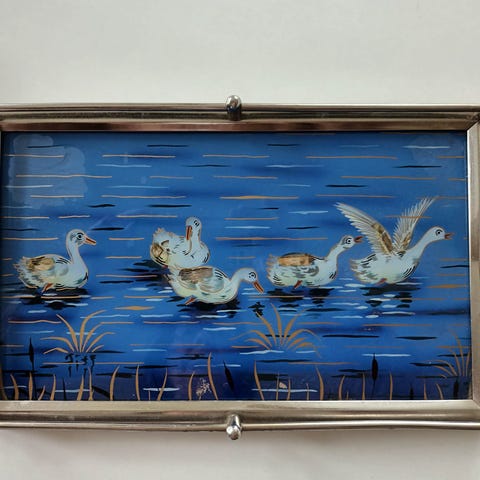 Eldre serveringsbrett i glass og metall. Perlemorinnlegg og fuglemotiv.