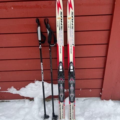 Madshus Kid Race langrennsski lengde 120 cm med tilhørende Fisher staver lengde 85 cm. Skiene har integrerte bindinger, og undersiden har mønstret såle for feste. Skistavene er i matchende farger med håndstropper og trinser til bruk på snø. Egner seg til klassisk langrenn på preparerte løyper.