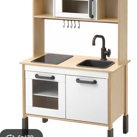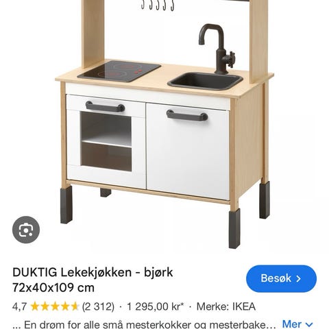 IKEA Duktig lekekjøkken i tre med hvite fronter. Lekekjøkkenet har komfyrplate med to kokeplater, vask med kran, ovn med dør og mikrobølgeovn øverst. Det har også hylleplass og kroker til oppheng av kjøkkenredskaper. Passer til barn som liker rollelek på kjøkkenet.