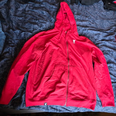 Offisiell L.F.C merch med høy krage, glidelås og lommer. Jakken har børstet, myk fleece på innsiden og føles tung og solid – god kvalitet sammenlignet med nyere supporterklær.