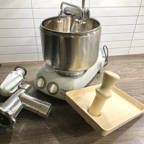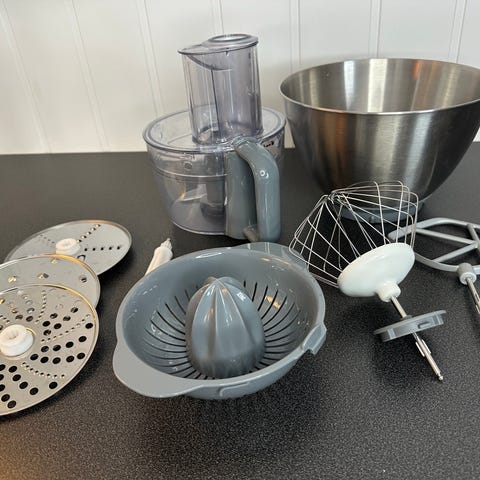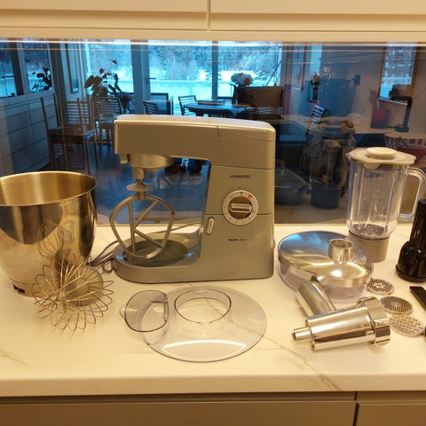 Kenwood KM600 kjøkkenmaskin. Modellen drives på 220–240 V / 50 Hz. På bildene vises blant annet bolle, visp, eltekrok og flere andre tilbehørsdeler som kan brukes til ulike kjøkkenoppgaver som elting, visping og kverning.