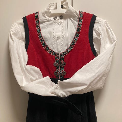 Festdrakt med skjorte, forkle og et nydelig gammelt håndbrodert belte