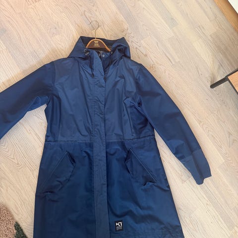 Blågrå regnjakke fra Kari Traa. Str M. Kan knytes i livet. Pent brukt.