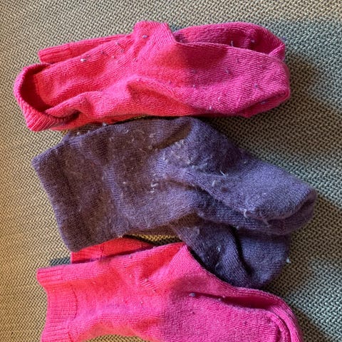 7 bomullssokker med antiskli, 2 par ullsokker, 2 par innetøfler, 1 par kosesokker, 2 par raggsokker i ull. Selges samlet.