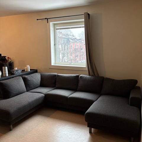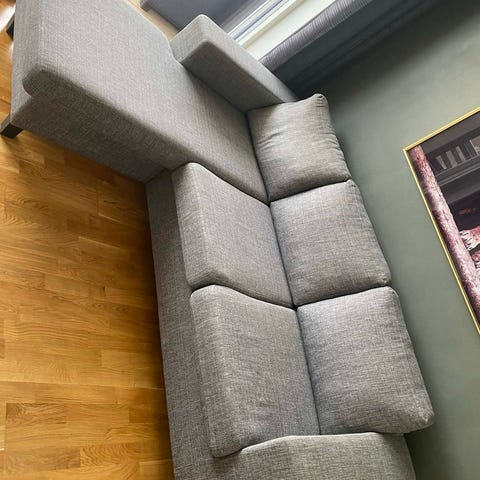 En hjørnesofa med lenestol; den er god og komfortabel.