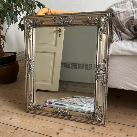 Pent brukt speil med pyntehylle. Laget i shabby chic-stil, så har litt gammel stil. Gis bort pga. plassmangel. Må hentes.