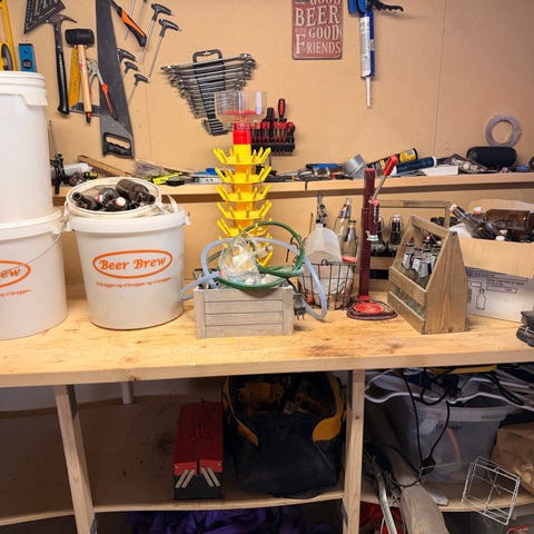 Bryggeutstyr for hjemmebrygging bestående av flere plastbøtter, målekanner og tilbehør, samt glassflasker i ølkasser. Utstyret inkluderer også en manuell flaskekorker og diverse smådeler som kan brukes i forbindelse med brygging, tapping og lagring av drikke. Egnet for hjemmebrygging der det er behov for bøtter til gjæring, flasker til tapping og kasser til oppbevaring og transport.
