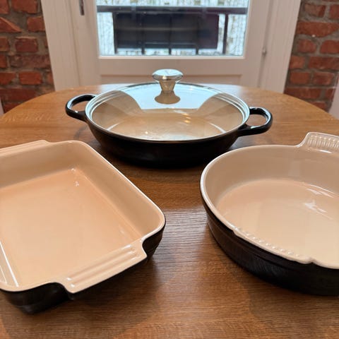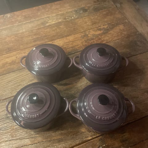 3 Le Creuset mini-gryter i keramikk i fargene hvit, grå og svart selges samlet.Små gryter egnet til porsjonsservering, tilbehør, desserter eller småretter. Kan brukes på bordet til servering eller som små former til ovnsretter, avhengig av produsentens anbefalinger for bruk og varmebestandighet.