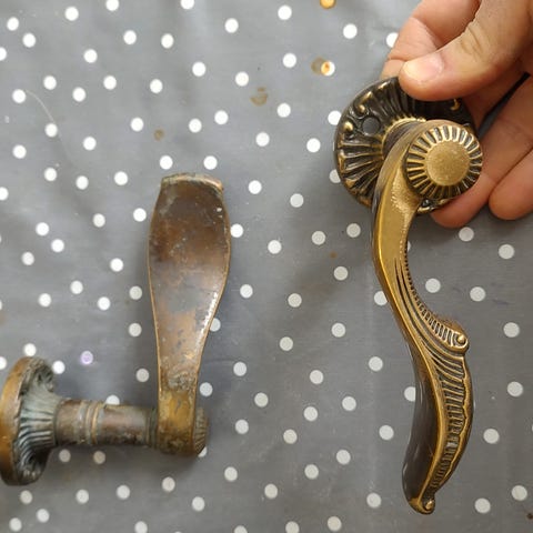 Dørvrider med tilhørende dørskilt i messing. Settet består av en vrider med mørkt håndtak og to rektangulære skilt med dekorative ender. Skiltene har hull for dørhåndtak og nøkkelhull, tilpasset innvendige dører med tradisjonell lås. Egnet for bruk på innerdører der man ønsker messingbeslag i klassisk stil.