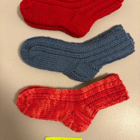 2 fine par blå ullsokker. Det ene paret måler ca 18 cm under, det andre 19 cm. Ikke strikket i samme garn (der ene er litt mer kompakt enn det andre). Pent brukt. Hentes eller sender mot frakt.