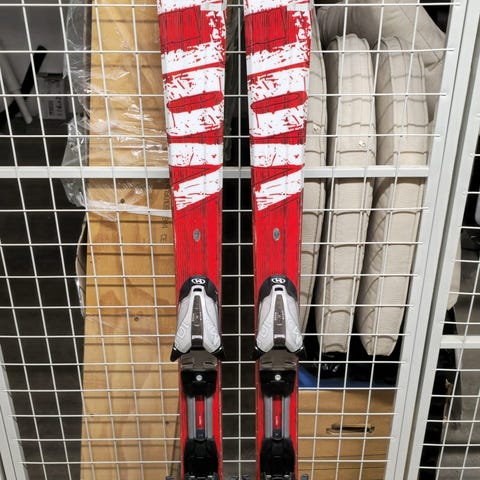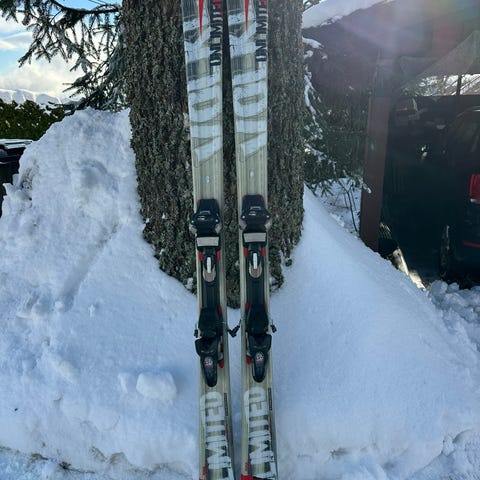 Völkl Unlimited alpinski i lengde 163 cm. Skiene har integrerte bindinger, som på bildene. Toppbladet har grått, svart og rødt design. Undersiden er svart.