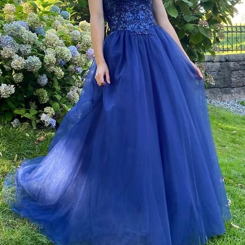 Alexandra Ritzi kjole til spesiell anledning i størrelse XS. Kjolen er blå og laget i tyll. Overdelen har tettsittende fasong, mens skjørtet er langt og vidt med flere lag tyll. Passer til formelle anledninger som ball, bryllup eller andre spesielle begivenheter. Kjolen passer til en som er 165 cm. Brukt på skoleball.