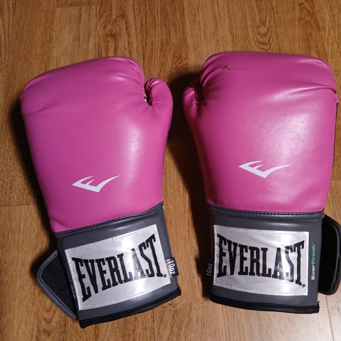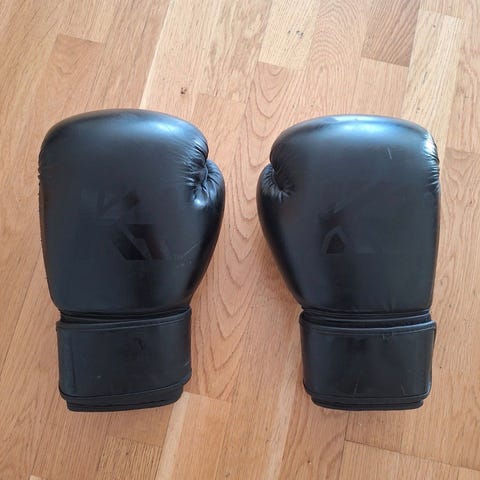 Everlast Powerlock boksehansker i størrelse 12 oz. Hanskene er svarte og har borrelåslukking rundt håndleddet for justerbar passform og støtte. Egnet for boksing og treningsøkter med sekk eller puter.