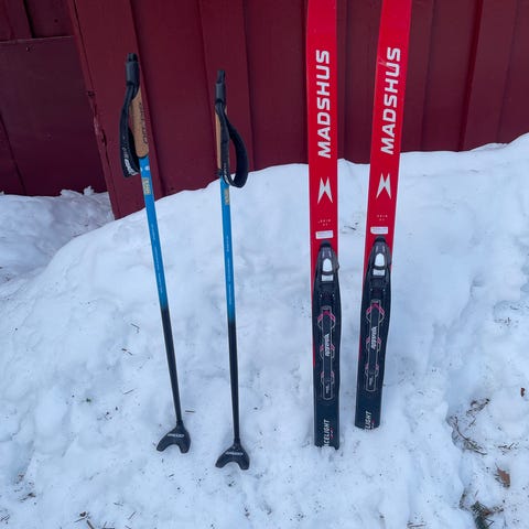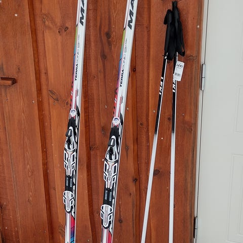 Madshus Race Pro felleski med Rottefella-binding. Skiene har integrert fell under sålen for feste.