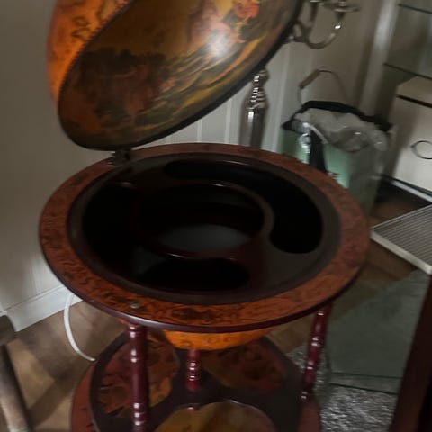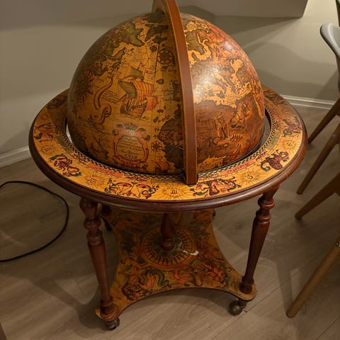 Barglobus barskap i tre med stativ. Globusen kan åpnes og har oppbevaringsplass til flasker og glass på innsiden. Innvendig er det dekorert med klassiske illustrasjoner. Nederst er det en rund hylle med plass til flere flasker, støttet av tre ben.