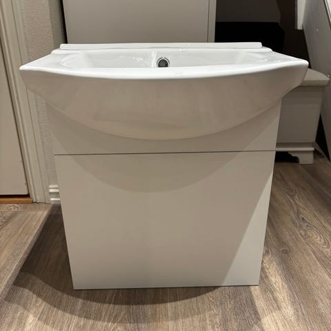 Baderomsinnredning med servantskap, servant og blandebatteri hvit