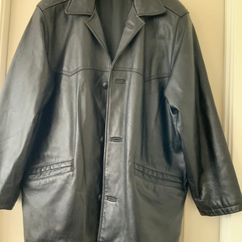 Skinnjakke for herre i størrelse XXL. Jakken er svart og laget i skinn, med quiltet innside. Modellen har krage, knappelukking foran og utvendige lommer. Passer som ytterjakke i overgangssesonger og kjøligere dager.