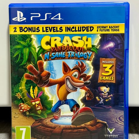 Activision Crash Bandicoot N. Sane Trilogy Playstation 4 spill. Samleutgave som inneholder tre Crash Bandicoot-spill i remastret versjon på én Blu-ray-plate. Spillet er beregnet for Playstation 4 og har aldersgrense 7 år. Fysisk utgave i standard PS4-eske.