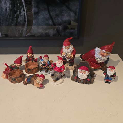 14 små nisser med røde striper på sokkene , dette var poppulært og samle på i mange år .Kan sende men ikke med Fix ferdig .