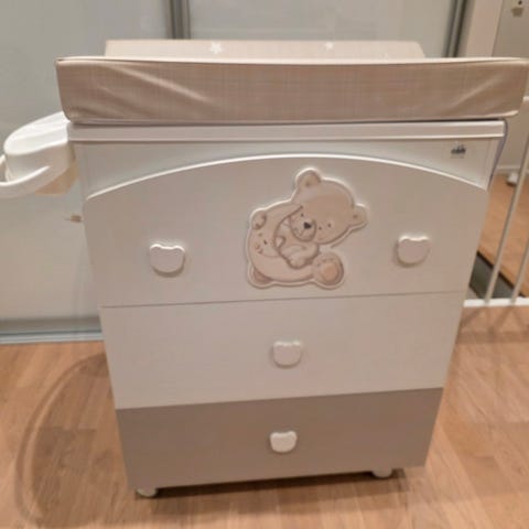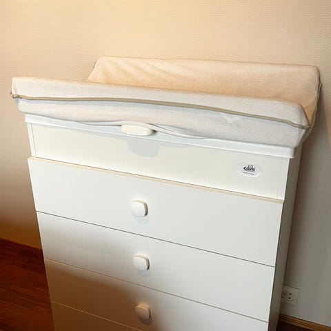 Kommode på hjul med badebalje og stellematte.