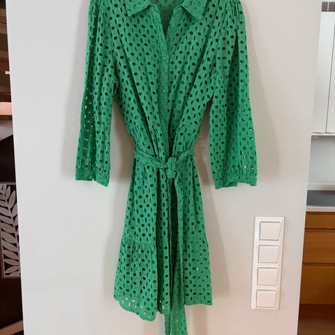 Marie Philippe sommerkjole i bomull i størrelse 36. Kjolen er rosa med mønster og broderie anglaise-lignende hullbroderier. Modellen har V-utringning, knapper foran og avtagbart knytebelte i livet. Ermer med lett puff og strikk nederst. Lengden går omtrent til leggen, avhengig av høyde. Passer som lett sommerkjole til hverdags og bruk ved varme dager.