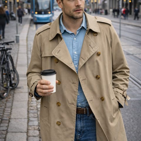 Kåpen er i beige med klassisk rutet fôr innvendig. Modellen har krage, knepping i front og justerbare stropper ved mansjettene. Lengden går ned mot knærne, og passformen er rett og romslig. Egnet som ytterjakke i overgangssesonger og milde vinterdager.