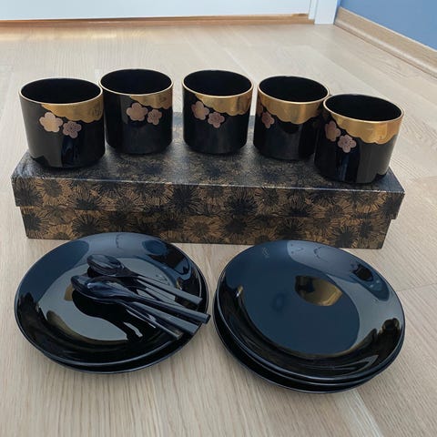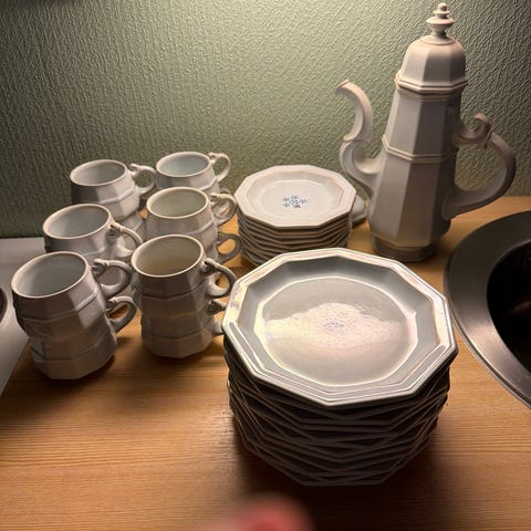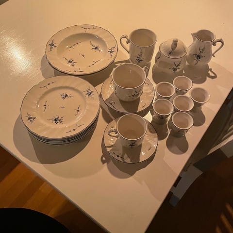 servise og glass, diverse deler. Bildene viser ulike typer tallerkener, kopper, mugger og skåler i porselen, samt flere glass i forskjellige størrelser og fasonger. Det inngår også noen boller og fat i glass. Settet består av ulike design og farger. Egner seg som dekketøy til servering av mat og drikke ved hverdag og selskap. Antall og eksakte mål fremgår ikke av opplysningene og kan eventuelt telles opp ved interesse.
