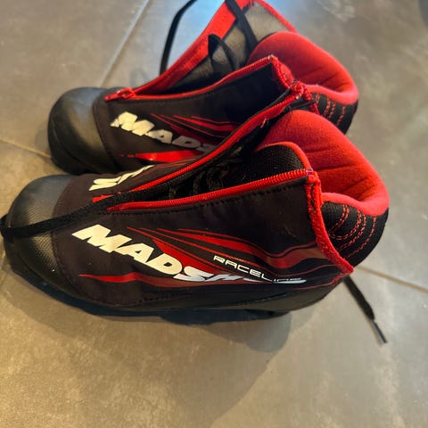 Madshus skisko i størrelse 31. Skoene har snøring kombinert med glidelås i front og forsterket tåparti. Passer til Rottefella bindinger.