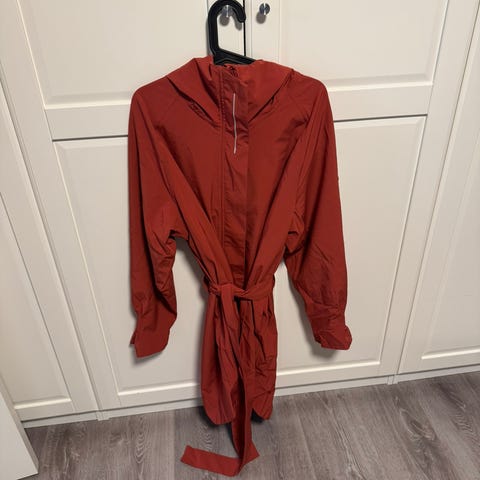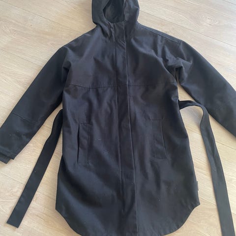 Twentyfour regnkåpe for dame i størrelse 42. Jakken er svart og laget i polyester. Vind og vanntett. Modellen har hette, belte i livet og lange ermer med justering ved mansjettene. Glidelås i front og refleksdetalj bak. Egnet som yttertøy i hverdagen og til lett friluftsbruk.