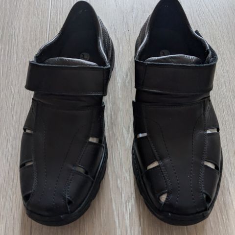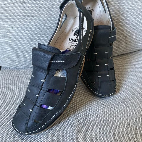 Skinnsandaler i str 39/40 til fotsenger/innleggsåler. Litt usikker på str men jeg bruker til vanlig str 40. Det står 6.5 i de og ifølge Google er det str 39. De passer hvertfall mine fotsenger i 40. Kan nok passe 39 også.