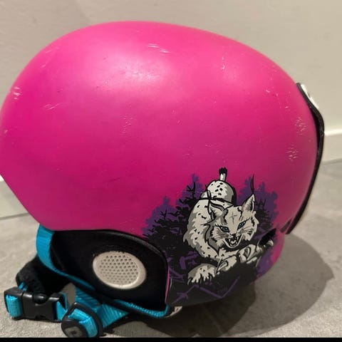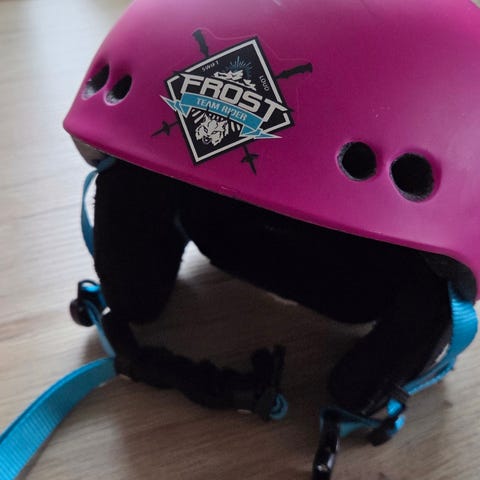 Frost Escape S-2150 slalåmhjelm i størrelse 50–54 cm. Hjelmen veier 350 gram og har hardt ytterskall i rosa med grafikk på sidene. Justerbar hakestropp og øreputer med ventilasjon. Egnet som alpinhjelm for barn i oppgitt størrelsesområde. Noen synlig merker, se bilder. Brukt med innerlue.