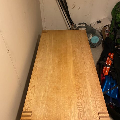 Planen var å pusse det ned og lysne det, men tiden strekker ikke til. Følger med to ileggplater på 40cm hver. Kan bli 140/180/220cm langt. Ene ileggplaten er litt ødelagt i ene hjørnet, kan pusses for å få en finere finish. Se bilde.