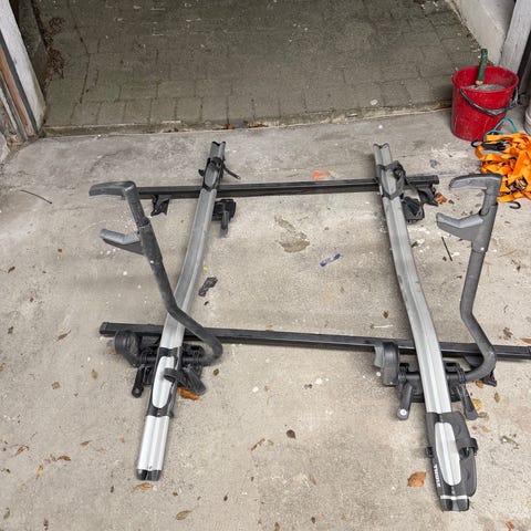 2 stk Thule takmontert sykkelstativ i aluminium med svarte plastfester. Stativene festes til takstativ/bagasjebærer på bilen og har justerbare hjulstropper og rammefeste for å holde sykkelen på plass under transport. Egnet for transport av én sykkel per stativ, avhengig av bilens takstativ og godkjent lastekapasitet. Selger 2 stativer. Passer de fleste standard takstativer med kompatibel festeløsning.