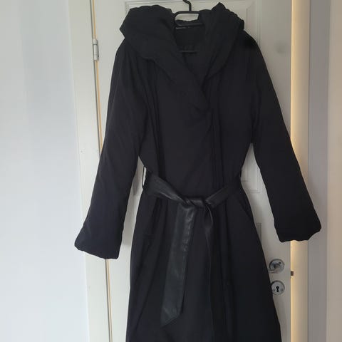 Zara kåpe for dame i størrelse L. Kåpen er svart og laget i polyester. Modellen har hette og knapper foran og avtagbart knytebelte i livet. Lengden går omtrent til over eller midt på kneet, avhengig av høyde. Passer som ytterjakke i overgangssesonger og mildere vinterdager.