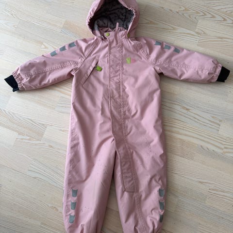 Kattnakken parkdress for jente i størrelse 92. Dressen er rosa og har avtakbar hette med trykknapper. Innside med mønstret fôr. Refleksdetaljer på ermer, ben og rygg for bedre synlighet. Elastikk ved ermer og ben samt fotstrikker under føttene for å holde dressen på plass. Glidelås foran med beskyttende klaff.