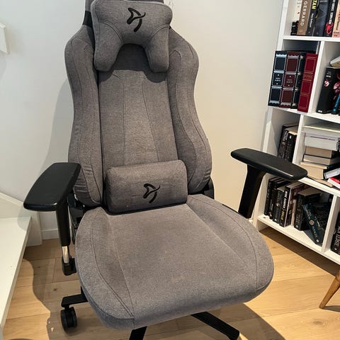 Arozzi gamingstol selges, pent brukt. Et par nupper på stolen som enkelt kan fjernes se bilde 4. Veldig behagelig og god stol for rygg. Nakkestøtte, ryggstøtte stor (den svarte på stolen) og ryggstøtte liten for korsrygg medfølger.