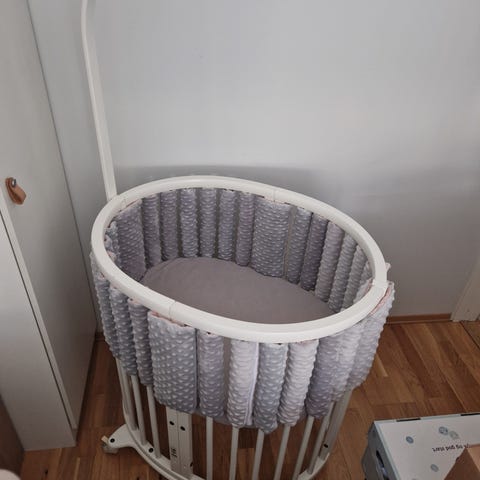 Hvit Stokke sleepi seng med hjul og madrass. Noen små bruksmerker, ellers i veldig god stand. Original Stokke sengekant og formsydd laken medfølger.