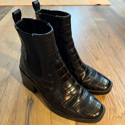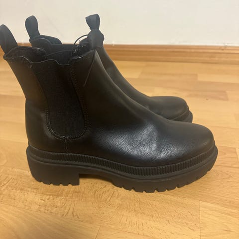 H&M støvler i størrelse 39. Støvlene er svarte med preget overflate som gir et strukturert uttrykk. Modellen har kraftig hæl 7,5 cm, elastiske felt på sidene og hempe bak for enklere av- og påtaking.