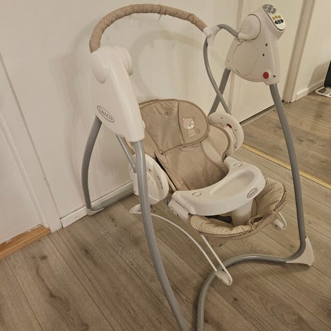 Selger en godt brukt vippsestol for baby. Den svinger fram og tilbake + det er forskjellige musikk. Gøy for baby :) Det er litt flekker på sete/beltet men det går ann å vaske det bort.