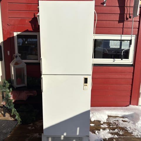 Bosch KSK38A45 kjøleskap i stål - gis bort. Godt brukt, arvet det av tidligere huseiere. Det fungerer. Trenger en rens bak, se beholder på bilde.