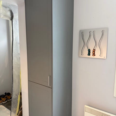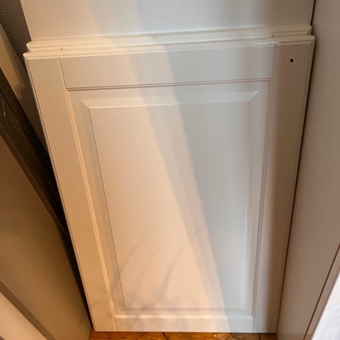 IKEA høyskap med en skuff, to skapdører og en hylle. Grå profilerte fronter.
