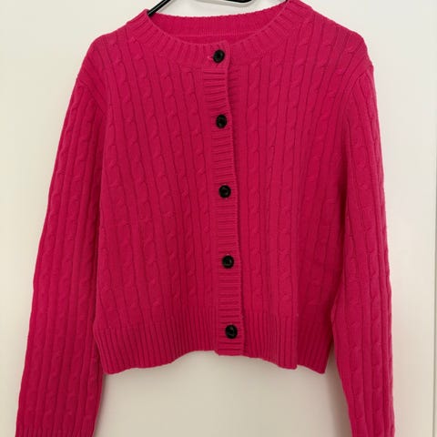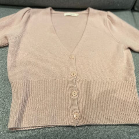 Nesten ubrukt cardigan i kasjmir for dame i størrelse M. Cardiganen er rosa og har rund hals og lange ermer. Den lukkes med knapper foran og har ribbestrikkede kanter nederst og på ermene. Materialet er 100 % kasjmir. Passer som lett og myk overdel til hverdagsbruk eller penere anledninger.