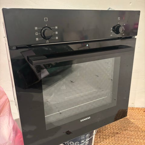 Innebygd stekeovn med front i hvitt og sort glass. Ovnen har varmluftsfunksjon, betjenes med to dreieknapper og et midtstilt display. Innvendig er det flere nivåer for plassering av rist og stekebrett. Leveres med rist og stekebrett etter hva som vises på bildene.